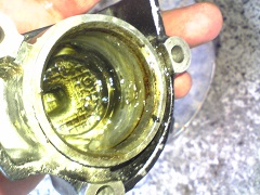 (2) プッシュロッド この棒を押し込むとクラッチが切れるのですね。 中に堆積物あり! ついでなのでカバーを外して掃除 |
